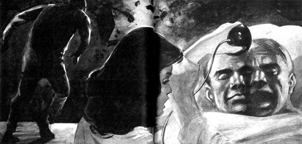 Five internes scurried in, surrounding the figure on the bed. Behind them strode rawboned Dr. Feld in a red hunting jacket. A motorchair rolled after him and stopped in the doorway, and an assistant administrator stood up and piped, "Hold him! He may be armed!"