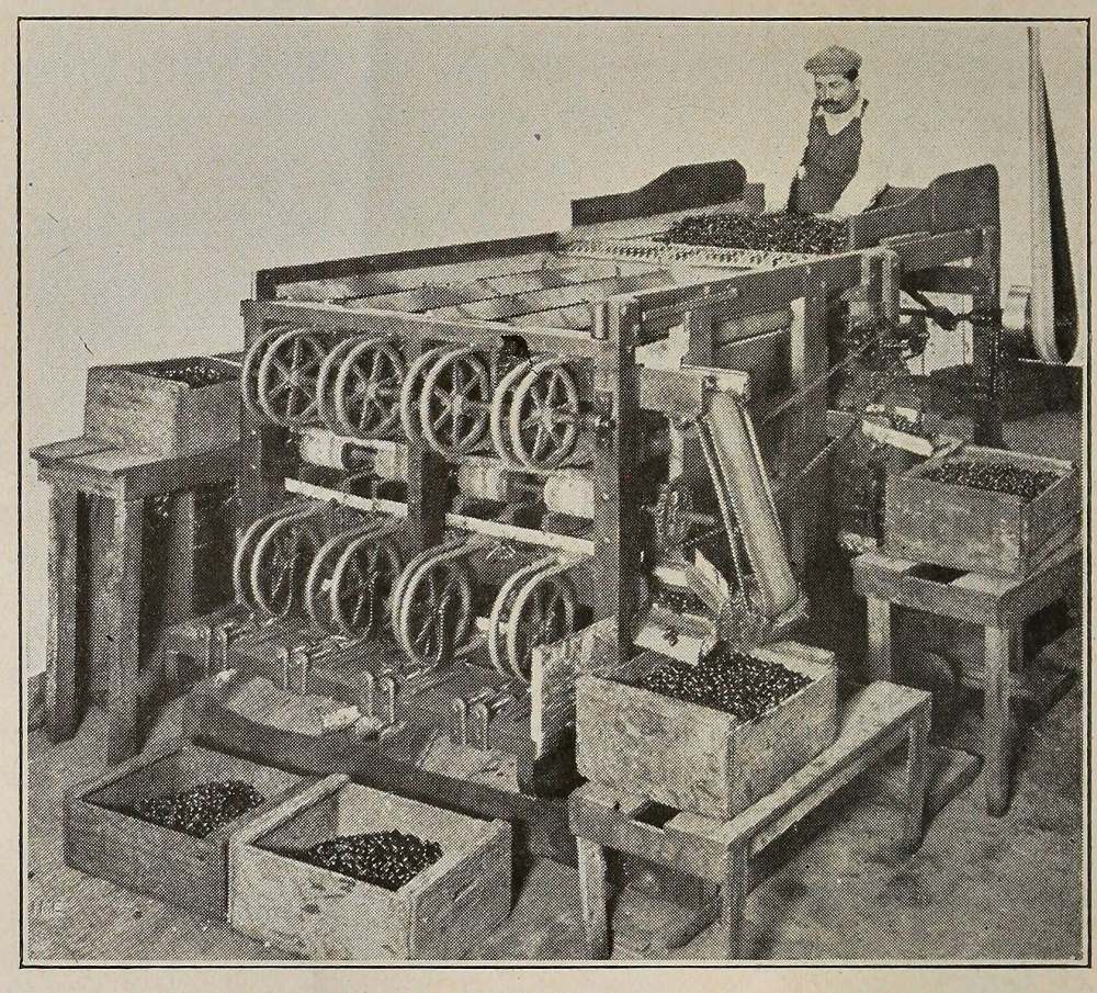 Many recipes have been left by the ancients, the preparations varying as to time, strength of solutions, mixtures of spices, etc. To the recipes of Palladius (1518-1580) is owed the knowledge that the Romans were cognizant of and used lye solutions, though this is supposed to be a modern practise. In this particular recipe sifted ashes are indicated as one of the ingredients, and it is supposed that this recipe, changed in detail, furnished the basis for present day methods. The use of wood ashes was introduced into France by an Italian refugee named Picholini, who settled in Provence, devoting himself to the preparation and sale of preserved olives. The olives preserved according to his process are called “olives a la Picholine”. Previous to his time the preparation in southern France consisted of crushing the olives lightly, immersing in clear water, which was renewed each{24} day for about nine days, then preserving in brine. This latter process is still employed for the olives in which appearance is not an asset. For the more carefully prepared ones, the method was to pick by hand when the olives had attained full development, then they were carefully sorted, and immersed in lye, the duration in the lye depending on the size of the fruit, and the concentration of the lye. They were removed from the lye when the flesh was penetrated to, and readily detached from, the stone.