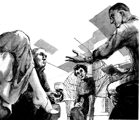 There were four persons. Paul Hanford swirled brandy in a snifter with a series of nervous gestures. Mrs. Hanford sat in the blackwood chair unhappily, despite the flattering glow of the wall-panels. Their daughter, Gloria, sat in such a way as to distract the visitor by presenting a target that his eyes could not avoid. Try as he would, his gaze kept straying to the slender, exposed bare ankle and the delicate, high-arched foot visible beneath the hem of the girl's dress.