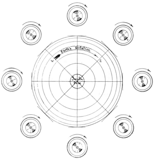 Suppose you were to place such a small wheel supported by its axis upon a larger wheel which also is revolving. The rotation of the larger wheel would so influence the smaller wheel that its axis would point in the same direction as the axis of the larger wheel. Why this is the case does not concern us here. Let it suffice that the larger wheel will cause the smaller wheel to behave in this manner. This is in accordance with a natural law. This law operates as unfailingly as the law which causes an unsupported body to fall to the ground.