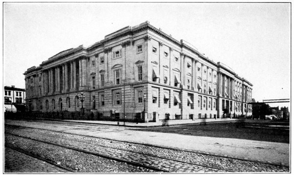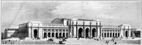 By the plans the public buildings of the future will be arranged around Capitol Square (which has now two sides occupied by private residences), and will then extend on both sides the mall, or flat, low-lying district 1,600 feet in width, extending from the Capitol building to the Potomac, a distance of one and a half miles, and inclosing the Washington monument. The buildings are all to be of white marble, harmonious in design, and with a standard sky-line. The latter feature is not pleasing in effect in the model. The Pennsylvania Railroad and the B. & O. Railroad have already given up their small stations, and now with all other roads passing through Washington run into a handsome new Union Station.