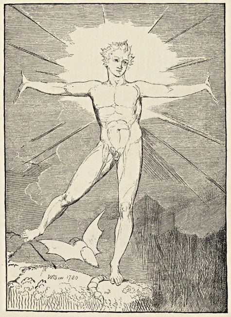 Blake is endowed in a very marked degree with the interest ascribed by Goethe to Problematische Naturen, men who must always remain more or less of a mystery to their fellows. In ancient times, and perhaps in some countries at the present day, he would have been accepted as a seer; in his own age and country the question was rather whether he[74] should be classed with visionaries or with lunatics. A visionary he certainly was, and few will believe either that his visions had any objective reality, or that he himself intended them to be received merely as symbols. “You can see what I do, if you choose,” he said to his friends. He thus confused fancy with fact; unquestionably, therefore, he laboured under delusions. But delusions do not necessarily amount to insanity, and, however Blake erred in form, it may be doubted whether in essentials he was not nearer the truth than most so-called poets and artists. Every poet and artist worthy of the name will confess that his productions, when really good for anything, are the suggestion of a power external to himself, of an influence which he may to a certain extent guide, but cannot originate or summon up at his will; and in the absence of which he is helpless. In personifying this influence as the Muse, or howsoever he may prefer to describe it, such an one is usually fully aware that, in obedience to a law of the human mind, he is bestowing personality and visibility upon what is actually invisible and impersonal, but not on that account unreal. Some there are, however, whose perceptions are so lively, or their power of dealing with abstractions so limited, that the mental influences of which they are conscious appear to them in the light of personalities. Such was Blake, and the peculiarity in him was probably closely connected with the childlike disposition which rendered him so amiable as a man. As a child it naturally never occurred to him to question the reality of his visions, and he grew up without acquiring the critical habit of mind which would have led him to do so. With him “the vision splendid” did not