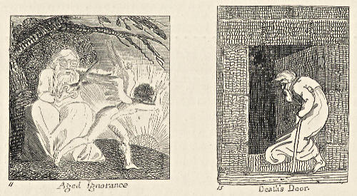 The end was now near. During 1827 Blake’s health greatly failed from catarrh and dysentery, and he could no longer go up to Hampstead to see Linnell. Linnell wished him to quit the damp neighbourhood of the river, and live in his own house in Cirencester Place, part only of which he used as a studio. But Blake said, “I cannot get my mind out of a state of terrible fear at such a step.” He also said, “I am too much attached to Dante to think much of anything else.” One of his last works was the colouring of The Ancient of Days for the elder Tatham, who paid him at a higher rate than he was accustomed to receive. Blake accordingly worked his hardest, and when it was finished “threw it from him, and with an air of exulting triumph exclaimed, ‘There, that will do, I cannot mend it.’” Later still he exclaimed to his wife, “You have ever been an angel to me, I will draw you,” and produced a sketch, “interesting, but not like.” On August 12 he died, “composing and uttering songs to his Maker.” He was buried in Bunhill Fields, in a grave which cannot now be identified. It is little to the honour of his countrymen that no public memorial of him should exist. A better one could not be than his own Death’s Door in the illustration to Blair’s Grave, treated as a bas-relief with the necessary modifications.