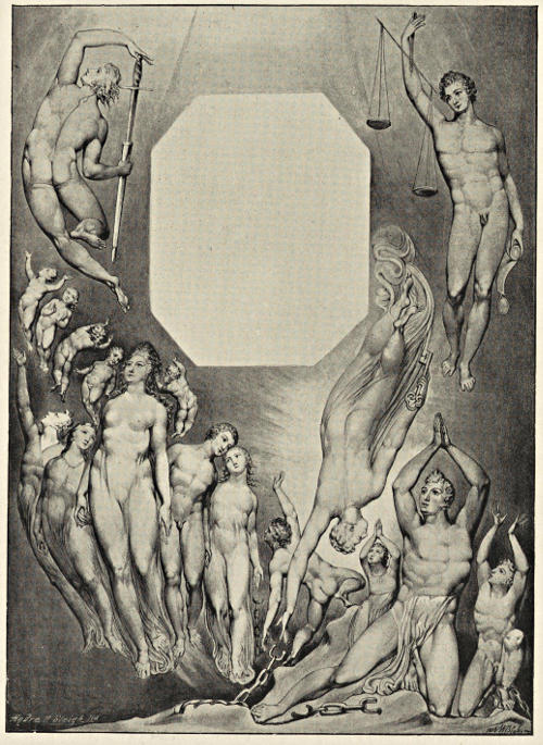 It is exceedingly difficult to obtain a proper idea of Blake as an artist, from the extent to which his designs depend upon colouring, and the great inequality of this colouring, which is often not his own. In Mr. Gilchrist’s opinion, the copy of The Song of Los, in the Print Room of the British Museum, and a volume of miscellaneous designs, in the same collection, represent him with adequate fairness; and these fortunately are public property. The finest specimens of his work seen by his biographer are apparently in the collection of the Earl of Crewe, and therefore not generally accessible. Those belonging to private collectors must of necessity be continually changing hands, and few students have the time or the opportunity to make the thorough investigation of them accomplished by Mr. Rossetti. Fortunately the illustrations in Gilchrist’s biography, where the whole of the Job series is reissued, suffice to establish Blake’s genius as a designer, even though destitute of the charm of colour. Mr. Bell Scott has executed effective etchings after him; Mr. Quaritch has republished the drawings for Comus; in 1876 the Songs of Innocence and Experience and the Prophetic Books up to Los were reprinted together, but only to the extent of a hundred copies, nor was the execution very satisfactory. It cannot be said that Messrs. Ellis and Yeats have entirely overcome the difficulties of reproduction; yet, perhaps, for those unable to obtain access to the copies tinted by the artist, or even to the uncoloured plates in the original edition, nothing so well displays the wilder and more weird aspects of his genius as the reprints in their third volume, especially those from Jerusalem.