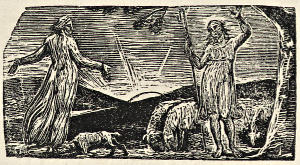 In 1821 Blake had performed another work of moment, his first and last wood-engravings. These were to illustrate Phillips’s imitation of Virgil’s first pastoral, republished by Dr. Thornton, a physician and botanist. Blake was a novice in this branch of art, and the cuts answer to Dr. Thornton’s own description of them: “They display less of art than of genius.” But nothing could more effectually confirm the principle enunciated by their critic in the Athenæum:[66] “Amid all drawbacks there exists a power in the work of the man of genius which no one but himself can utter fully.” Rude as they are, their force is extraordinary; few things can be more truly magical than the glimpse of distant sea in the second of those engraved by Gilchrist. At the same time they are not in the least Virgilian, and in this respect form an instructive contrast with the exquisite though unfinished Virgilian illustrations of Samuel Palmer. Palmer, though putting in a cypress now and then as a tribute to couleur locale, provides Virgil substantially with the same style of illustration as he had been producing all his life for other ends, and yet this seems as appropriate to the text as Blake’s is discrepant. It is interesting to speculate what effect an Italian residence of two or three years, such as Palmer had enjoyed, would have produced upon Blake beyond the inevitable one of dissipating his monstrous delusions about Italian artists. He would probably have gone chiefly with the view of studying Michael Angelo, but we suspect that the influences of Italian landscape would in the long run have proved fully as potent.