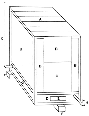Now, before proceeding further, it will be as well to touch upon various points of procedure, and also to describe what may be reckoned the most important piece of a collotype plant, viz., the drying oven. Figure 17 gives a drawing of the oven as it stands on the table for use, the {168} dimensions being from the top to the bottom of the frame 5 feet by 3 feet 4 inches wide by 3 feet deep. The top A, and the back, are covered with matched boards well seasoned; the sides and front, B, B, B, B, are made of frames 2 inches by 1 inch, covered with canvas sufficiently close to exclude light, but still open enough to let out the heat slowly. The door C is also a frame covered with canvas, 24 inches square, sliding upward in grooves, and balanced by means of weights. D is the jacket of iron upon which a copper tank rests, the jacket serving to carry the tank and to protect the wood-work from the gas flame used to warm the water in the tank. E is a sliding door in the jacket for the purpose of lighting the gas burner. F F are the projecting ends of a levelling arrangement forming the base of the oven, these ends being fitted with good, strong screws working upon iron plates let into the top of a strong table upon which the oven is placed. The distance between the two lower rails or styles is 6 inches, which is also the height of the iron jacket. D G is a tube let into the jacket to carry off the products of combustion from the gas. H is a tube with a screw nozzle, for filling the tank.