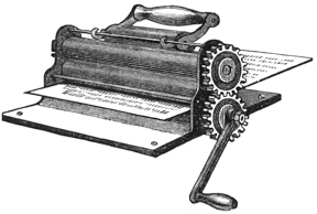 Write, draw, or trace the original with a steel pen and the ink, on well calendered paper, not too thick. For drawing, a fine pen is the best. Then lay it, written side up, in a shallow dish, cover the paper with the transfer solution, leave it from four to five minutes. If the writing is several days old, leave it longer—about ten minutes. Lay it between blotting paper and dry gently by rubbing with the hand or a cloth. Then lay it, written side down, upon the polished plate, pass it from four to six times under the iron roller, having first placed a pasteboard over it. To prevent slipping, it is well to cover the original with a sheet of blotting paper before putting the pasteboard {179} over it. If you are not sure your press is screwed up evenly, run the plate through two or three times, then turn it end for end and pass it through as many times the other way.