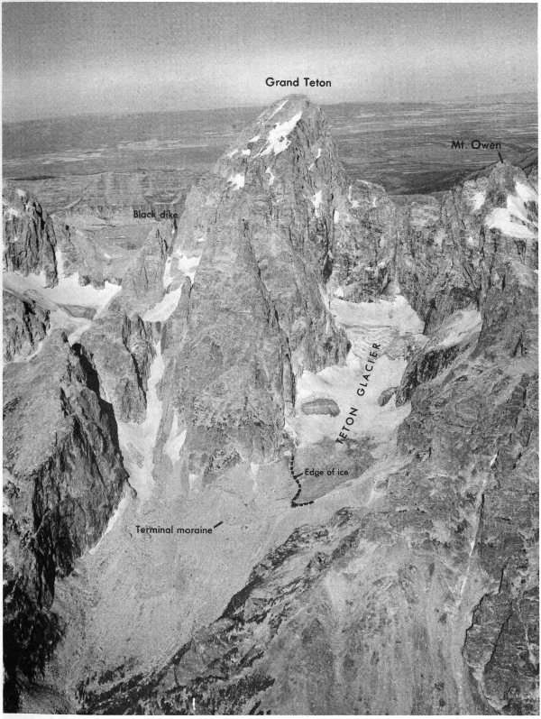 About a dozen small rapidly dwindling glaciers exist today in shaded reentrants high in the Teton Range. They are probably vestiges of ice masses built up since the climatic optimum, during the so-called “Little Ice Age.” These glaciers, while insignificant compared to those still present in many other mountain ranges, are fascinating working models of the great ice streams that shaped the Tetons during Pleistocene time.