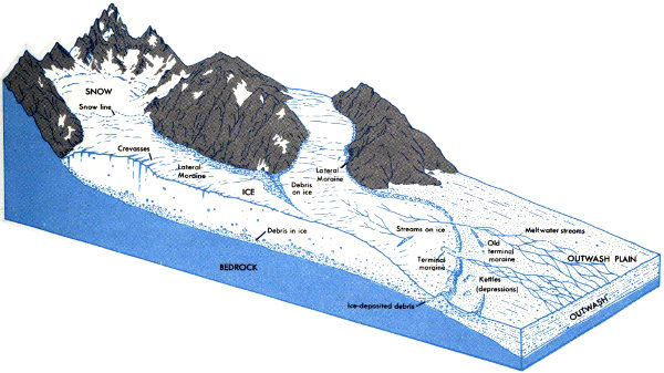 At least three times in the last 250,000 years glaciers from the surrounding highlands invaded Jackson Hole. The oldest and most widespread glaciation probably took place about 200,000 years ago; it was called the Buffalo Glaciation by Prof. Eliot Blackwelder in 1915 (see selected references). The age estimate is based on measurements of the thickness of the decomposed layer on the surface of obsidian pebbles in the glacial debris. Major sources of ice were the Beartooth Mountains (fig. 1), the Absaroka Range, and the Wind River Range. The Gros Ventre Mountains and Teton Range furnished lesser amounts of ice.