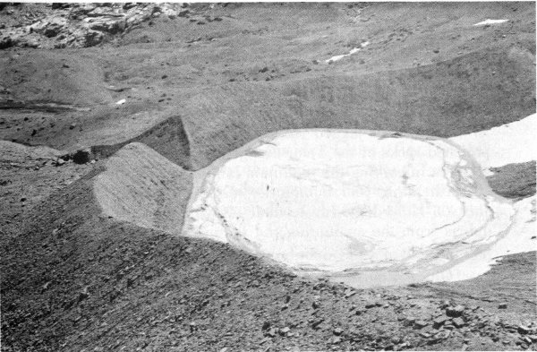The Teton Glacier (fig. 6) is one of the best known. It is an ice body about 3,500 feet long and 1,100 feet wide that lies at the head of Glacier Gulch, shaded by the encircling ridges of the Grand Teton, Mount Owen, and Mount Teewinot. Ice in the central part is moving at a rate of more than 30 feet a year.