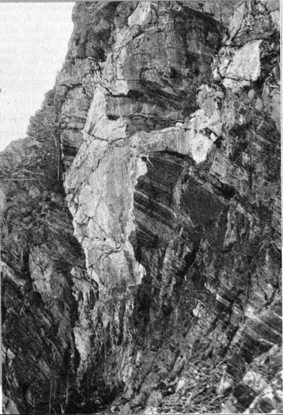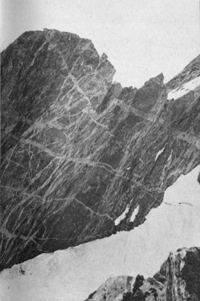 Absence of weak layers prevents breaking of the tough rock masses under their own weight. All these conditions, then, are favorable for preservation of steep walls and high rock pinnacles. Nevertheless, they do break down. Great piles of broken rock (talus) that festoon the slopes of all the higher peaks bear witness to the unrelenting assault by the process of erosion upon the mountain citadels (figs. 4 and 31).