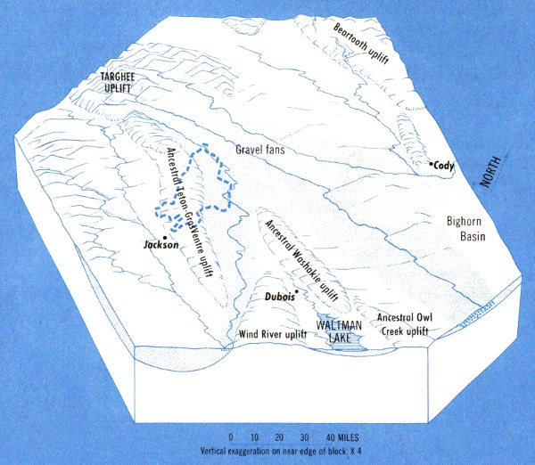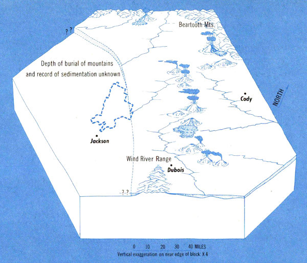 What happened to the vast thicknesses of volcanic debris? We know they existed because sections of them have been measured on the eroded edges of uptilted folds and fault blocks. Many cubic miles of these rocks are now buried beneath the floor of Jackson Hole, but a much greater volume was carried completely out of the region by water, 104 ice, and wind during the final chapter of geologic history.
