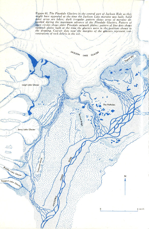 The glacier withdrew rapidly northward from the Burned Ridge moraine, leaving behind many large irregular masses of stagnant, debris-covered ice. The sites of these became kettles, locally known as “The Potholes” (fig. 12). The main glacier retreated to a position marked by the loop of moraines just south of Jackson Lake (fig. 60). Figure 61 is a sketch map showing how the glaciers in this part of Jackson Hole might have appeared at the time the Jackson Lake moraine was built.
