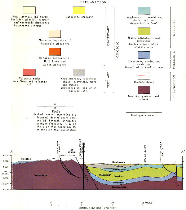 Most geologic processes that developed the Teton landscape have been beneficial to man; a few have interfered with his activities, cost him money, time, effort, and on occasion, his life. Postglacial faulting and tilting along the southern margin of Grand Teton National Park diverted drainage systems (such as Flat Creek, southwest of the Flat Creek fault on the south edge of the geologic map), raised hills, dropped valleys, and made steep slopes unstable. Flood-control engineers wage a never-ending struggle to keep the Snake River from shifting to the west side of Jackson Hole as the valley tilts westward in response to movement along the Teton fault. Each highway into Jackson Hole has been blocked by a landslide at one time or another and maintenance of roads across slide areas requires much ingenuity. We see one slide (the Gros Ventre) that blocked a river; larger slides have occurred in the past, and more can be expected. Abundant fresh fault scarps are a constant reminder that public buildings, campgrounds, dams, and roads need to be designed to withstand the effects of earthquakes. Some of these problems have geologic solutions; others can be avoided or minimized as further study increases our understanding of this region.