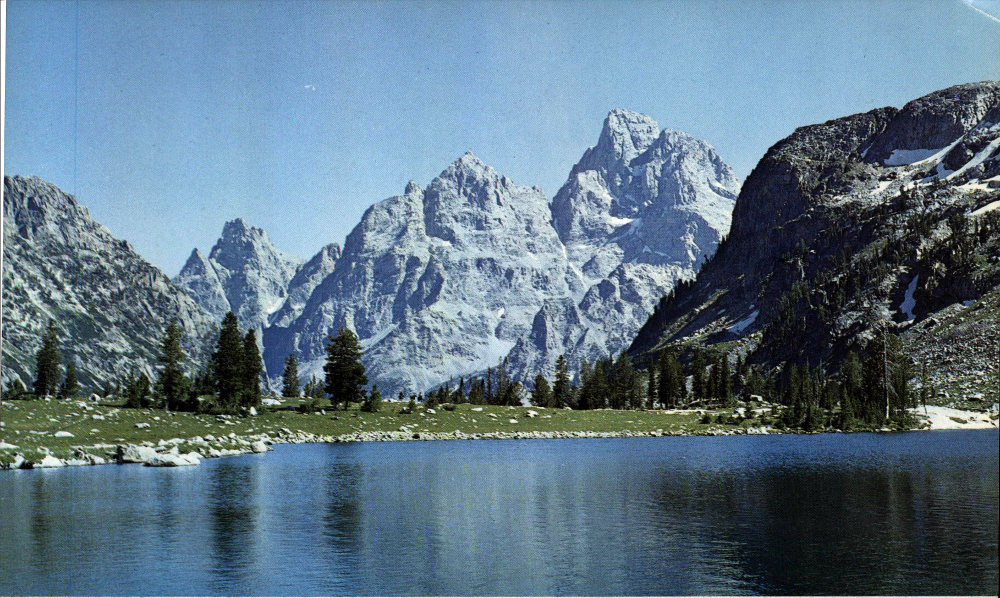 View southwest from Lake Solitude toward the Grand Teton (right), Mt. Owen, and Mt. Teewinot. Wyoming Travel Commission photo by J. R. Simon.