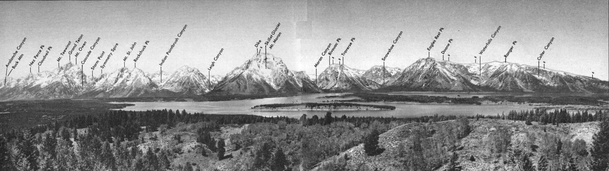Grand Teton, Mt. Owen, and Mt. Teewinot from Jenny Lake Flat. National Park Service photo by W. E. Dilley.