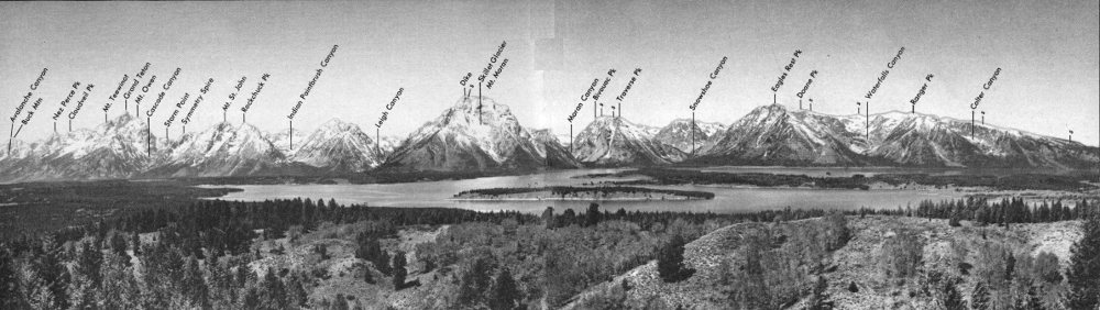 The view east presents the greatest contrasts in the shortest distances—the flat floor of Jackson Hole is 3 miles away and 7,000 feet below the top of the Grand Teton. Along the junction of the mountains and valley floor are blue glacial lakes strung out like irregular beads in a necklace. They are conspicuously rimmed by black-appearing margins of pine trees that grow only on the surrounding glacial moraines. Beyond these are the broad treeless boulder-strewn plains of Jackson Hole. Fifty miles to the east and northeast, on the horizon beyond the rolling hills of the Pinyon Peak Highlands, are the horizontally layered volcanic rocks of the Absaroka Range. Southeast is the colorful red, purple, green, and gray Gros Ventre River Valley, with the fresh giant scar of the Lower Gros Ventre Slide near its mouth. Bounding the south side of this valley are the peaks of the Gros Ventre Mountains, whose tilted slabby gray cliff-forming layers resemble (and are the same as) those on the west flank of the Teton Range. Seventy miles away, in the southeast distance, beyond the Gros 23 Ventre Mountains are the shining snowcapped peaks of the Wind River Range, the highest peak of which (Gannett Peak) is about 20 feet higher than the Grand Teton.