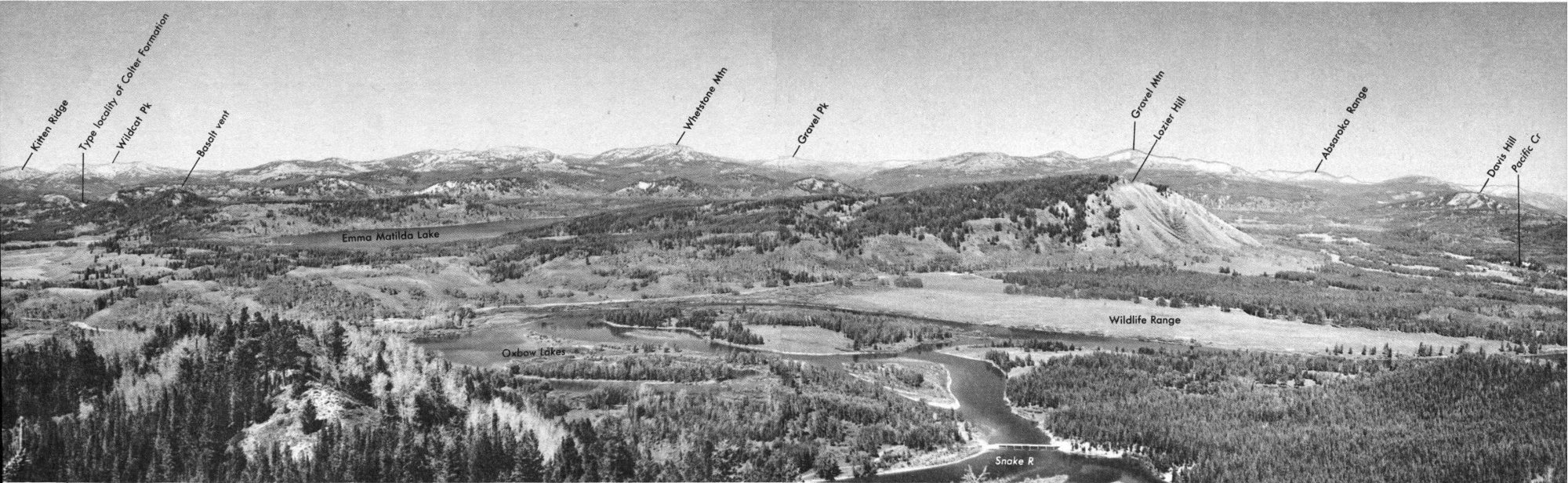 Figure 53. Air oblique view south, showing the north end of the Teton Range disappearing beneath Pleistocene lava flows. Light-colored bare area at lower left is vertical Paleozoic limestone surrounded on three sides by nearly horizontal rhyolite lava flows. Bare slope at lower right is west-dipping Pinyon Conglomerate, also overlapped by lava. Grand Teton is on right skyline and Mt. Moran is rounded summit on middle skyline.