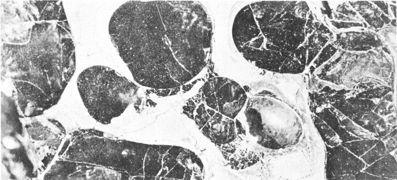 Although the light and sound effects that accompanied the Ussuri and Norton falls were similar, the meteorites recovered from them were not at all alike. The Ussuri specimens were masses of nickel-iron so malleable that on high-speed impact with hard rock they had held together and taken twisted and ragged shapes. But the Norton meteorites were very fragile stony masses, many of which went to pieces either in the air or when they struck the ground. Almost all of the recoveries made of this very rare type of stony meteorite were fragments, not whole specimens. They somewhat resembled pieces of a strange whitish mixture of chalk and crystalline limestone containing tiny specks and lumps of nickel-iron. Many specimens were covered wholly or in part by a shiny varnish-like fusion crust, varying in color from jet black through yellow to almost pure white.