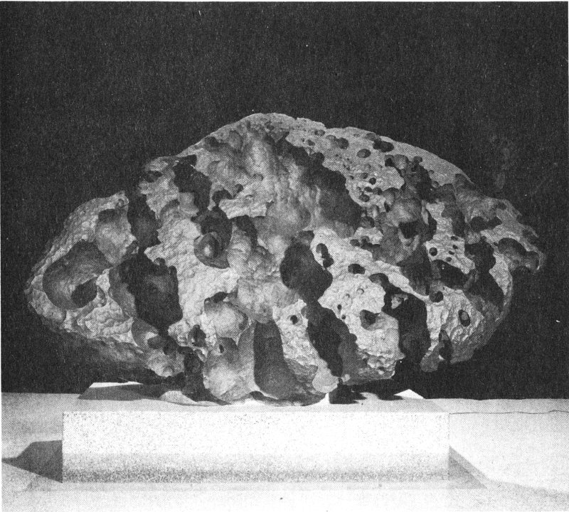 After the great meteorite had been raised out of the excavation, it was taken by truck to the University of New Mexico, in Albuquerque. There it was put on display beside the smaller 130-pound fragment found in May. By careful measurements, scientists determined the weight of the main mass to be approximately 2,360 pounds—a record weight for stony meteorites.[1] This remarkable meteorite, known as the Furnas County, Nebraska, stone, is now a prized item in the collection of the Institute of Meteoritics.