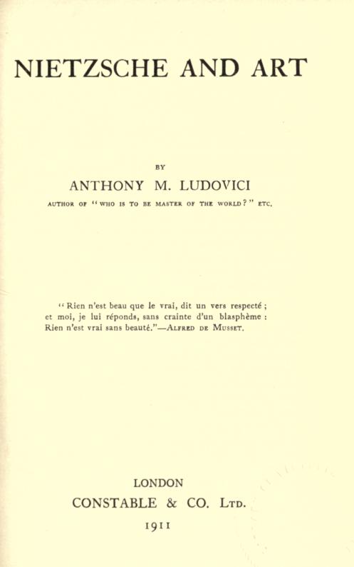 In this book, which embodies a course of lectures delivered in a somewhat condensed and summarized form at University College, London, during November and December, 1910, I have done two things. I have propounded Nietzsche's general Art doctrine, and, with the view of illustrating it and of defining it further, I have also applied its leading principles to one of the main branches of Art.