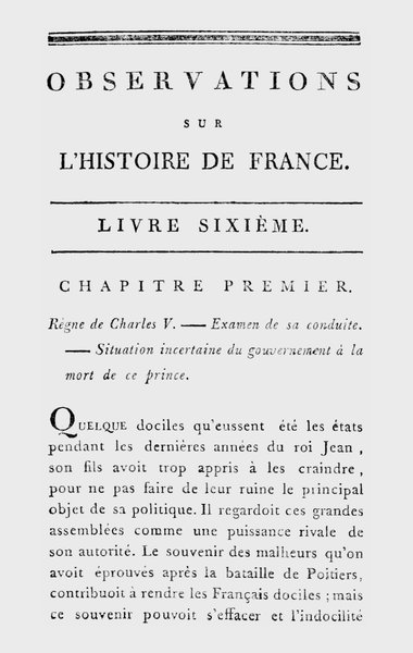 Il est vraisemblable que les Capétiens ne cessèrent de se rendre à leur parlement avec régularité, que quand cette cour, un peu dégradée, ne fut plus composée de leurs principaux vassaux. Les mêmes raisons qui dégoûtèrent les seigneurs de l’administration de la justice, après l’abolition du duel judiciaire, en durent aussi dégoûter ces princes. Bientôt je parlerai fort au long de l’autorité que le parlement commença à prendre sous les successeurs du roi Jean. Je me contenterai de rappeler ici ce que j’ai déjà prouvé dans les livres précédens, que n’y ayant point d’états-généraux ou d’assemblées de la nation, avant le règne de Philippe-le-Bel, les prédécesseurs de ce prince, soit pour acréditer l’opinion qui leur attribuoit la puissance législative, soit pour donner plus de force à leurs établissemens, les venoient eux-mêmes publier dans le parlement, et cette cérémonie se faisoit toujours avec beaucoup d’éclat. Charles V rétablit cette coutume oubliée, pour qu’on regrettât moins les états-généraux. Les officiers du parlement 572 avoient de la réputation et il étoit sûr de les conduire à son gré.