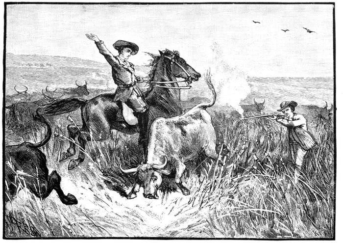 8It is true, that there were plenty of people around him. His Uncle John and Cousin Ned lived in the same house with him, and there were a score or more of men, Americans and Mexicans, employed on the ranche as house-servants and herdsmen. He had four playmates close at hand—that is, two of them lived five miles east of him and the others eight miles west—and they were jolly fellows and he liked to be in their company. The time never hung heavily on his hands, for he was very industrious, and could always find something useful to do; but still he was lonely and homesick every hour in the day. The old house was not the same now that it was during his father’s lifetime. Uncle John had built additions to it, rearranged the inside of it to suit himself, and filled it with the most expensive furniture, such as had never been seen in the wilds of Texas before.