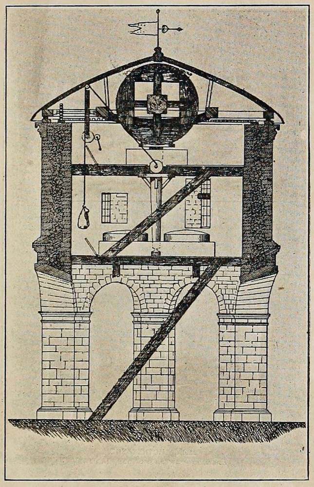 The steam engine came into use in the early part of the nineteenth century. By 1825 most of the principal English cities had it in use. Before that period, and dating back to remote ages, the only sources of power—other than man or bullocks, etc.—were the two great forces of wind and water. But only countries of waterways and varying levels afforded waterfalls; while the wind was universal. Therefore, while water wheels were in use in parallel periods with the oldest of windmills, in number they were infinitely less, so that one can properly say that the world’s motor for some eight centuries was the old-time windmill. These eight centuries are from about 1000 to 1825, when, with the advent of Watt’s invention, the zenith of windmill design and use had been attained. After that date they so declined that in fifty years not only had new construction ceased, but the old structures in very large measure had fallen into decay and{172} abandonment. It is evident from the above that an account of this old, picturesque, historic and effective tool of mankind should have some interest, both from the standpoint of engineering and that of sentiment; and it is believed that what follows will give the essential facts relating to it. It may be proper to say here that what is related applies entirely to the old-style windmill, and in no measure whatever to the modern American type of windmill, which, while cheap, effective and useful, is nevertheless a prosaic, galvanized iron, squeaky thing, of which happily the larger proportion of the millions annually made is exported out of our country!