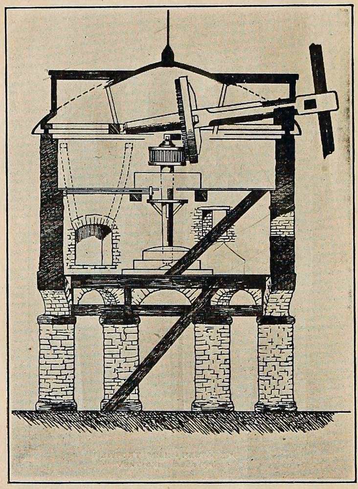 Of old post mills of the usual wood form France has plenty, of which the one on top of Montmartre, in the Moulin de la Galette grounds, is perhaps the most prominent. It is one of the two or three remaining that were part of a dozen or more that crowned that hill in the early days, as shown in several views of old Paris. What changes it has seen in its 600 years of accredited age! In its timbers are shot and balls of the revolutions of 1814 and 1871. Within are the old bells and bunks and shrines of the generations of millers who operated it, one of whom is said to have been killed and quartered and hung on the four arms of his own mill by the successful assailants. In the same premises is a dear little miniature mill, which, with diminutive stones of but 18 or 20 inches in diameter, was used for grinding spices, in place of the usual grain for bread.