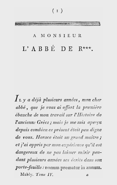 Il y a déjà plusieurs années, mon cher abbé, que je vous ai offert la première ébauche de mon travail sur l’Histoire de l’ancienne Grèce; mais je me suis aperçu depuis combien ce présent étoit peu digne de vous. Horace étoit un grand maître; et j’ai appris par mon expérience qu’il est dangereux de ne pas laisser mûrir pendant plusieurs années ses écrits dans son porte-feuille: nonum prematur in annum. II Il est impossible de juger avec justice un ouvrage qu’on vient de finir; il faut l’oublier; on le revoit alors de sang-froid et avec les nouvelles connoissances qu’on a acquises; notre amour-propre d’auteur ne nous dérobe plus nos erreurs et nos fautes; il nous les présente, au contraire, comme autant de preuves des progrès que nous avons faits.