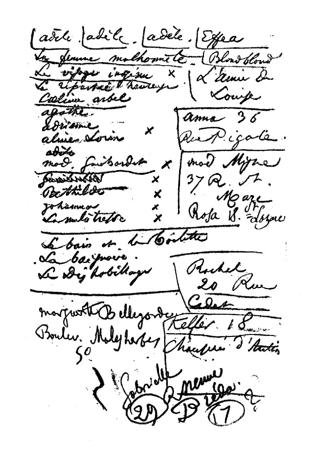 Je me trouve dans de vastes galeries, communiquant ensemble,—mal éclairées,—d'un caractère triste et fané,—comme les vieux cafés, les anciens cabinets de lecture, ou les vilaines maisons de jeu. Les filles, éparpillées à travers ces vastes galeries, causent avec des hommes, parmi lesquels je vois des collégiens.—Je me sens très triste et très intimidé; je crains qu'on ne voie mes pieds. Je les regarde, je m'aperçois qu'il y en a un qui porte un soulier.—Quelque temps après, je m'aperçois qu'ils sont chaussés tous deux.—Ce qui me frappe, c'est que les murs de ces vastes galeries sont ornés de dessins de toutes sortes, dans des cadres. Tous ne sont pas obscènes. Il y a même des dessins d'architecture et des figures égyptiennes. Comme je me sens de plus en plus intimidé, et que je n'ose pas aborder une fille, je m'amuse à examiner minutieusement tous les dessins.