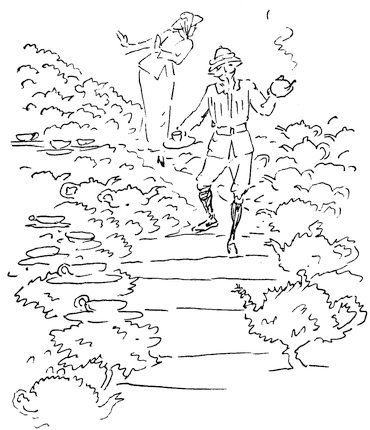 One afternoon we had a walk up the opposite hills, the track being mostly through tea-plantations, with forest bits occasionally. The tea tree left to itself apparently grows high on a stem, having a very striking character and shape, suggesting almost the stone-pine. The small, thick-stemmed, closely-trimmed, flat-headed dwarf bushes which are its characteristic forms in the tea plantations also have an interesting effect in some situations on the hill-sides, intersected by wandering paths whereon the dark natives move up and down. The tea-plant has a leaf somewhat of the character of a laurel or orange tree, and its flower recalls that of the orange. Ceylon tea when made is of a beautiful clear orange colour—I mean when poured from the pot.