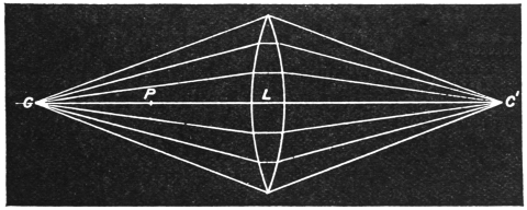 These points will be seen on reference to Fig. 2, in which L being the lens, and P the principal focus, as before, rays from the point C are brought together at the conjugate focus C', at the same distance on the other side of L. In this case it manifestly does not matter whether the object be at one or the other of these points.