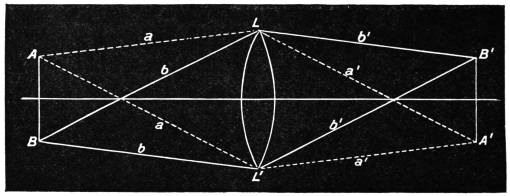 So far we have been dealing with points on the line of the axis of the lens. The facts mentioned apply equally, however, to rays entering the lens at an angle to the axis, only that in this case they diverge or converge, correspondingly, upon the other side. It is evident, from Fig. 1, that no image is formed of a point situated at the distance of the principal focus; but Fig. 3, which is really an extension of Fig. 2, shows how the rays passing along secondary axes form an inverted image of the same size as the object, when the latter is situated at twice the focal length of the lens from this last. To avoid confusion, the bounding lines only are shown, but similar lines might be drawn from each and every point of the object; and if the lines ALA', BL'B' be supposed to be balanced at L and L' respectively, they will indicate the points at which the corresponding parts of the object and image will be situated along the lines AB, B'A' respectively. Moreover, rays pass from every part of the object to every part of the lens, so that we must imagine the cones LAL', LA'L' to be filled with rays diverging on one side of the lens and converging on the other.
