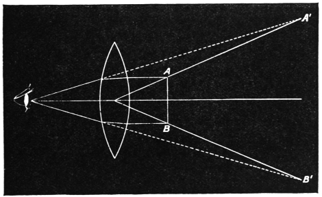 The microscopic image, on the other hand, is a virtual image, which can be viewed by the eye but cannot be thus projected, for it is formed by an object placed nearer to the lens than the principal focal length of the latter, so that the rays diverge, instead of converging, as they leave the lens, and the eye looks, as it were, back along the path in which the rays appear to travel, and so sees an enlarged image situated in the air, farther away than the object, as shown in Fig. 4. In this case, as the diagram shows, the image is upright, not inverted.