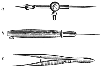A mixture of wax and almond oil, in proportions varying with the heat of the weather, usually about equal ones, is prepared. The piece of tissue is freed from superfluous spirit by being placed on a bit of blotting-paper for a minute or two, and is then immersed in a quantity of the wax-and-oil mixture contained in a little box of paper or lead-foil. The tissue is held on the point of a needle, and lifted up and down until it is coated with the mixture, and, before solidification of the mass sets in, is lowered into the box and left to cool. The block now furnishes a handle, and this should be wrapped round with paper, the sections cut with the keenest possible razor, and as thin as possible, and placed in spirit as cut. From the spirit, which must be the strongest obtainable, they are placed in the clearing liquid, carbolic and turpentine, and then slid on to the slide, a drop of balsam placed on the section, and the cover over all. Of late years all sections of ordinary soft tissues, animal or vegetable, have been cut by one of the infiltration methods, in which the interstices of the tissue are filled up by some material which prevents the relations of the cells from being altered during the process of cutting. To enter fully into this matter would occupy too much space, and would serve no useful purpose, for the worker who requires to make use of such means will find it indispensable to obtain Bolles Lee’s Microtomist’s Vade Mecum, in which the whole matter is exhaustively treated.