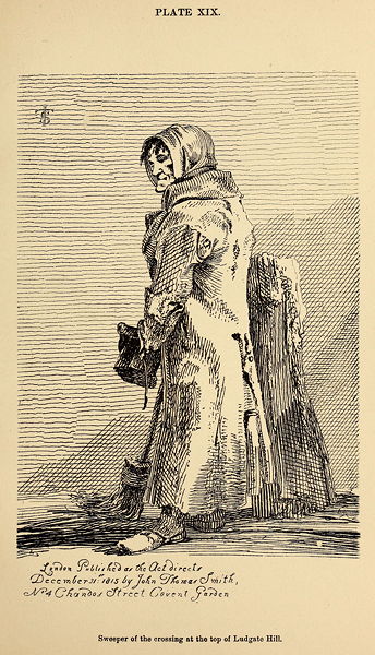 The next character portrayed is a constant sweeper of the crossing at the top of Ludgate Hill. This man finds it his interest to wear a cloth round his head, as he is on that account frequently noticed by elderly maiden city dames, who mistake him for one of their own sex.