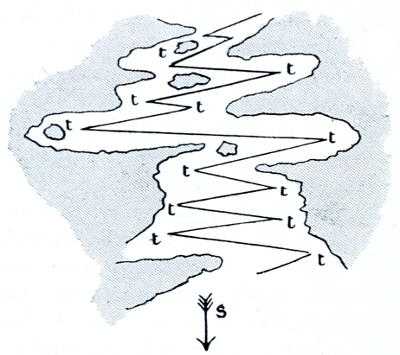 There can be little doubt but that the greatest development of the ski has taken place in Europe, notably in Scandinavia, where they have been modified to suit the different requirements of the districts in which they are employed. Thus have the varied types hitherto been many, but may be divided generally into two groups, viz., the short and broad, or loose snow ski, and the long and narrow, or compact snow variety (“skare ski”), this latter pattern being represented by the Oesterdal and Swedish ski (originally one very long and one short ski, but now generally of equal length). These are the most suitable for open country, whether in the lowlands or mountains, and on level or undulating land are superior, so far as speed is concerned, to all others; but in broken country, or on mountains where obstacles such as trees, rocks, &c., are to be met with, the shorter or “loose snow” patterns, owing to their handiness, are invariably employed. 8