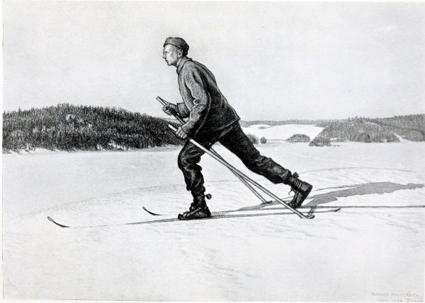 We are further greatly indebted to the many friends who have rendered us positive assistance. The frontispiece is from Herr Halström’s wonderful picture “Paa Skare,” which that gentleman has given us unqualified leave to reproduce. The ski-runner which it depicts also serves as a central figure for the cover, designed by Mr. Nico Jungman. To those who have iv kindly permitted us to copy their photographs we hereby take the opportunity of expressing our best thanks. The outline of the Solberg Hill is from an accurate drawing by Herr Von de Beauclair published in Ski, to the editor of which paper we are also indebted for the drawings illustrating Herr Sohm’s detachable seal’s-skin and climbing-irons. To Herr S. Höyer-Ellefsen, Herr Fredrik Juell, Herr Trygve Smith, Herr Durban Hansen, and numerous other skilful Norwegian runners we are grateful for many a useful hint and word of advice, whilst we owe to Herr Zdarsky a valuable practical demonstration of his methods of teaching. Messrs. C. W. Richardson, E. H. Wroughton, and H. P. Cox have been kind enough to help with the actual production of the little work, and if there be any others who we have omitted to mention we would hereby beg them to accept at once both our apologies and thanks.