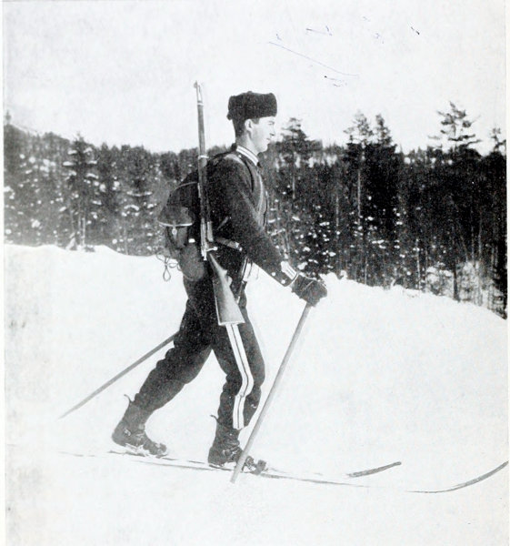 It may be well now to touch upon ski-ing proper, or the employment of ski for the purpose for which they were originally intended, viz., travelling over snow-clad land or ice. By means of these appliances people are enable to roam at will, enjoying the fresh, crispy air, the pretty landscape, and changing scenery, combined with the pleasant sensation of gliding, instead of tramping, over the surface of the country. The speed attained is certainly not very great, and is about the same in hilly as on level country, for in the former the time lost in ascending slopes is made up on the descent. In racing, the time made by the best men, travelling lightly clad, and under the best conditions of snow and weather, works out at about eight and a half miles an hour on a course of a little over nine miles, and nearly eight miles an hour on one of eighteen and a half miles. In racing, the longest distance ever run at a stretch was covered by a Lapp, who, at Jokkmokk, in Sweden, made a good 137 miles in 21 hours and 22 minutes, over comparatively level ground, thus at a rate of about six and a half miles an hour. 12 Ordinary travellers, or soldiers on ski, would find five to five and a half miles an hour quite sufficient to tax their powers. In 1900, a detachment of the Norwegian Guards accomplished a march of 125 miles in seven and a half days, an average of some seventeen and a half miles a day, which must be looked upon as a very good performance, considering that they carried canvas wherewith to improvise tents, sleeping bags, and provisions, and moved up hill and down dale, once ascending to a height of 4,000ft. above the sea level. It will thus be seen that, in marching trim, soldiers on ski do not travel faster, or to any great extent faster, than infantry at other times, the only advantage of the ski being that, when the snow lies, they are able to move about, and get along in parts where men not provided with such appliances, or snowshoes, would be compelled to remain idle.