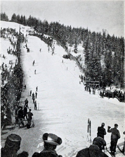 Having now given an outline of the history and origin of the ski, it may be well to refer to the movement by which ski-ing has been brought into the prominent notice of sportsmen and admirers of winter pastimes. In the extensive and mountainous district of Telemarken, Norway, one in which ski were employed possibly more extensively than in any other, owing to its remoteness, and the wretched state of the few highways and byways to be found there, the peasants discovered that the ski might be used for pleasure as well as ordinary pursuits, and arranged meetings at which races were run, and the leaping powers of competitors tested on the slopes of selected hills. By degrees news of these trials of skill found its way to the towns and the populated districts in their neighbourhood, and some few citizens having found ski-ing to be a good, and to them attractive, exercise, determined to hold similar meetings at Christiania each winter. The accounts given of those meetings are very ludicrous, the hill being neither steep nor long, the competitors riding astride their poles down the track, and only jumping, if jumping it could be called, a few yards. The exhibitions did not “catch on,” and were discontinued for many years. The townsfolk knew too little about the sport to appreciate it, and the absurd, if not painful, appearance of the competitors was not encouraging to aspirants. Towards the end of the seventies, however, owing chiefly to the exertions of the Christiania Ski Club—a select institution with but few members—some Telemarken peasants4 were induced to visit the capital, and in the early part of 1879 a ski meeting was held on the slopes of the hill at Huseby, near Christiania, which was attended by a couple of the countrymen, who took part, together with other competitors, in the races and leaping that had been arranged. The Huseby slope was one which, only a few years previously, had been described as highly dangerous, and impossible to descend when the snow was fast and in good condition.