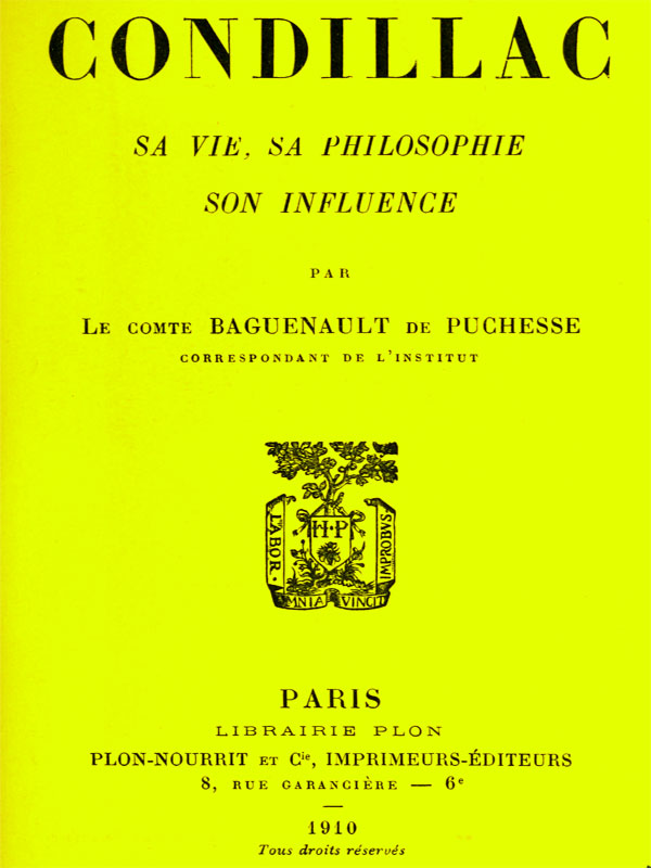 Condillac laissa en mourant des papiers manuscrits à Mme de Sainte-Foy, en demandant qu'ils ne soient ouverts que quelque temps après sa mort. Au moment de la Révolution, craignant les perquisitions politiques, sa nièce déposa ces papiers à 1 hospice de Beaugency. Beaucoup plus tard, M. de Boisrenard fit ouvrir le paquet et n'y trouva que des morceaux d'ouvrages déjà connus et imprimés, sauf tout un grand travail sur la langue française, 25 que le petit-neveu de l'auteur offrit en 1852 à la Bibliothèque nationale et qui s'y trouve aujourd'hui sous les nos fr. 9090-96, autrefois Suppl. fr. 4657-1-5. Ce sont cinq beaux volumes petit in-folio intitulés: Dictionnaire des synonimes de la Langue française, mais qui présentent en réalité un dictionnaire français complet, avec définitions, acceptions diverses, exemples, dont la copie est très correcte et contient en marge de nombreuses notes de l'écriture même de Condillac. L'ouvrage est tout prêt à imprimer; et il en serait digne, si la science n'avait fait depuis, en linguistique particulièrement, des progrès dont la constatation serait sans doute trop redoutable. 26