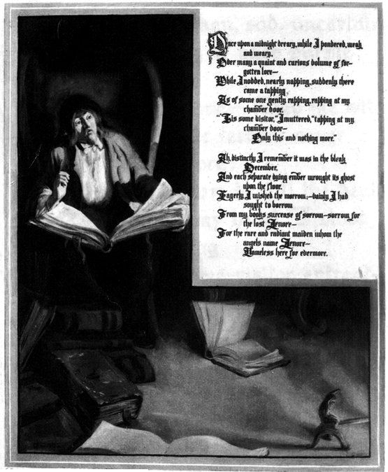 The locale being thus determined, I had now to introduce the bird—and the thought of introducing him through the window was inevitable. The idea of making the lover suppose, in the first instance, that the flapping of the wings of the bird against the shutter is a “tapping” at the door, originated in a wish to increase, by prolonging, the reader’s curiosity, and in a desire to admit the incidental effect arising from the lover’s throwing open the door, finding all dark, and thence adopting the half-fancy that it was the spirit of his mistress that knocked.