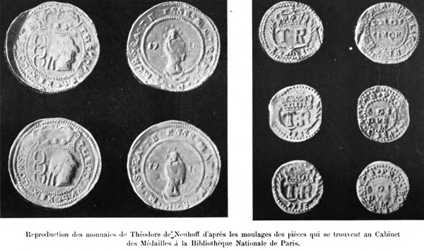 Quelques reproductions de gravures: portraits ou pamphlets, un fac-similé d'écriture, une planche de monnaies d'après des moulages, complètent les documents que j'ai pu recueillir sur Théodore de Neuhoff.