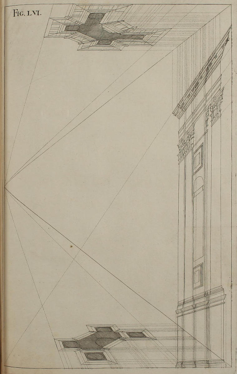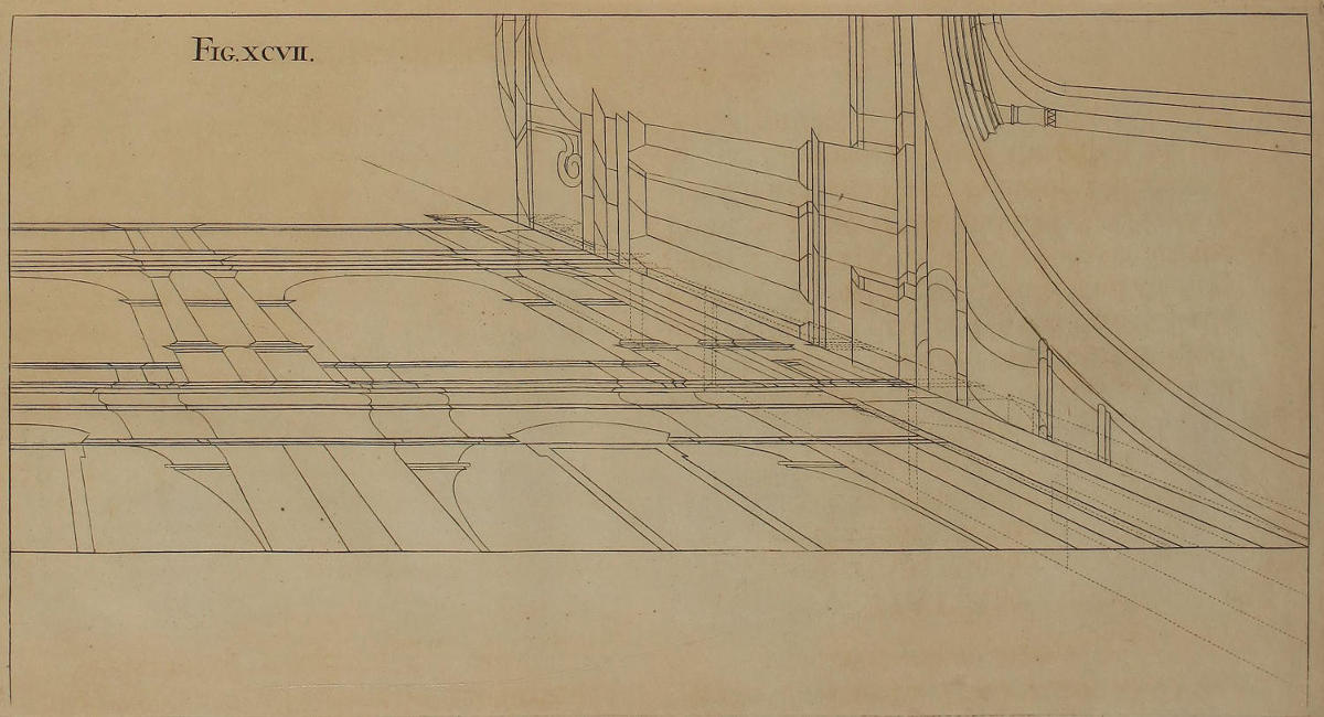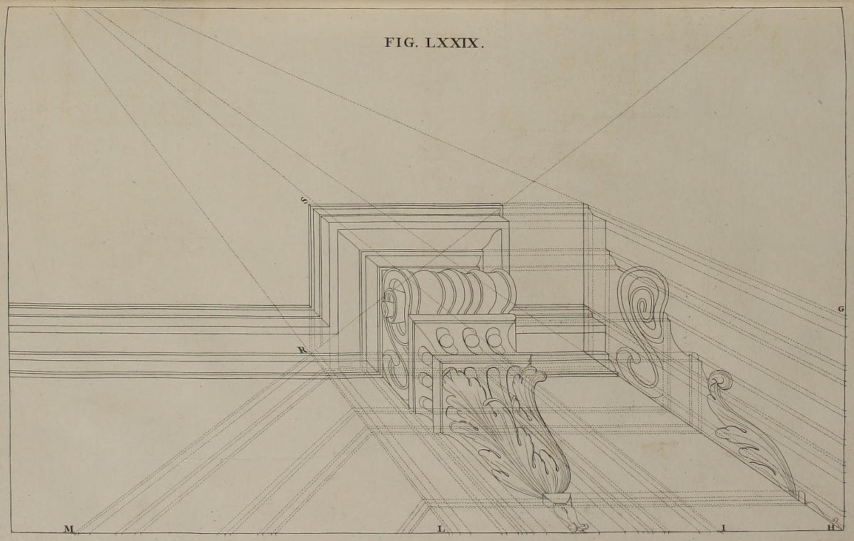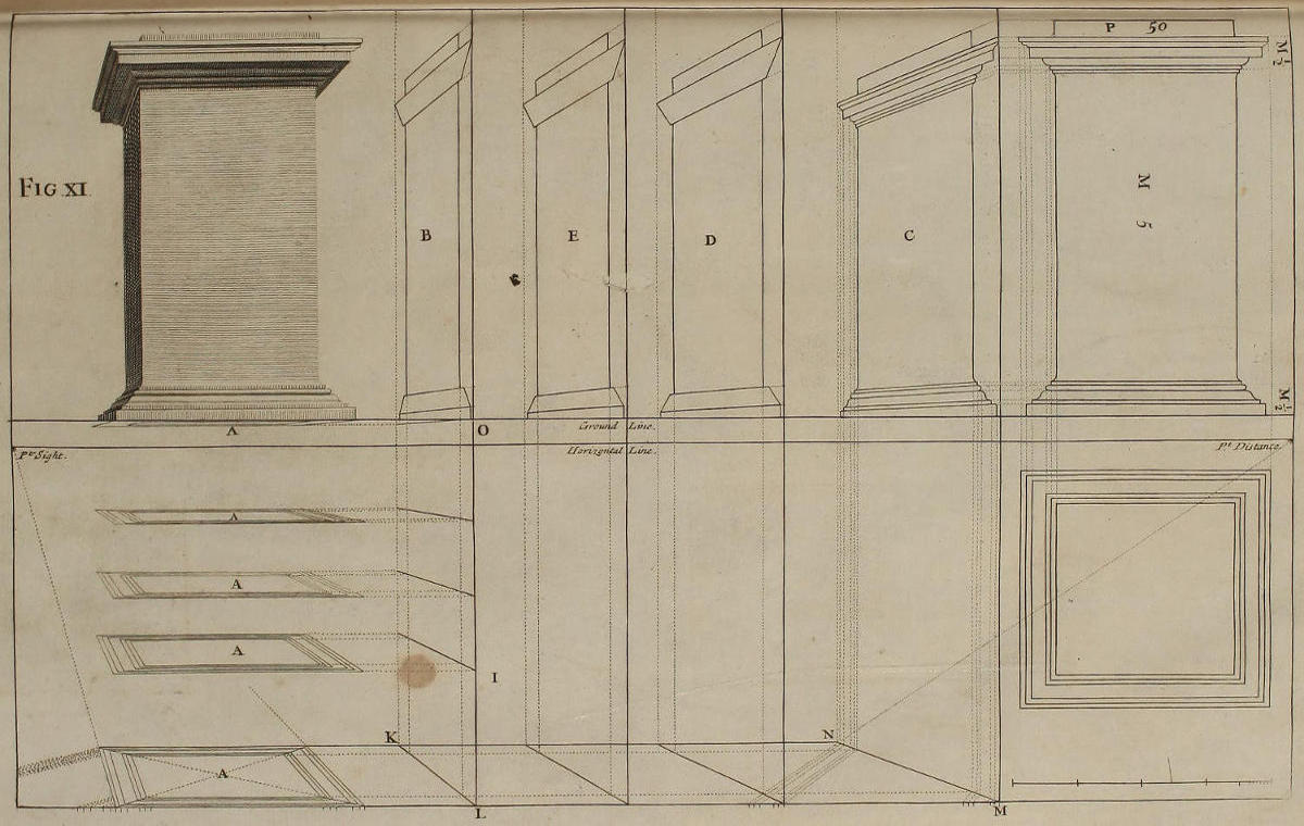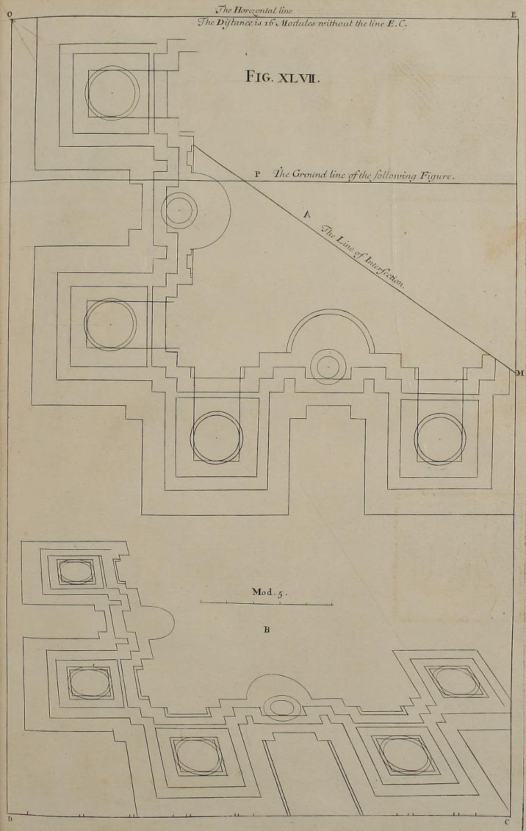 ’Tis something unaccountable, that, among so many learned Persons as have handled this Subject, Priests, Architects, and Painters; very few, if any of them, have given Directions proper for shunning that Disorder and Confusion of Lines, which, in most Instances, must necessarily attend the Execution of their Rules: In all or most of which, the whole Space for the Performance is confin’d between the Lines of the Plan and Horizon; which, where the Scale is small, and the Height of the Eye not very much advanc’d, renders the Work exceedingly confus’d; and where those Lines are coincident, (which frequently happens) the Method becomes utterly impracticable.