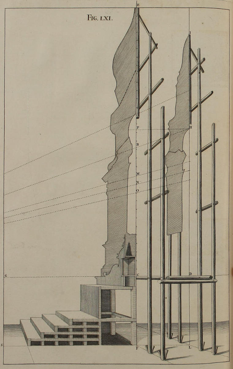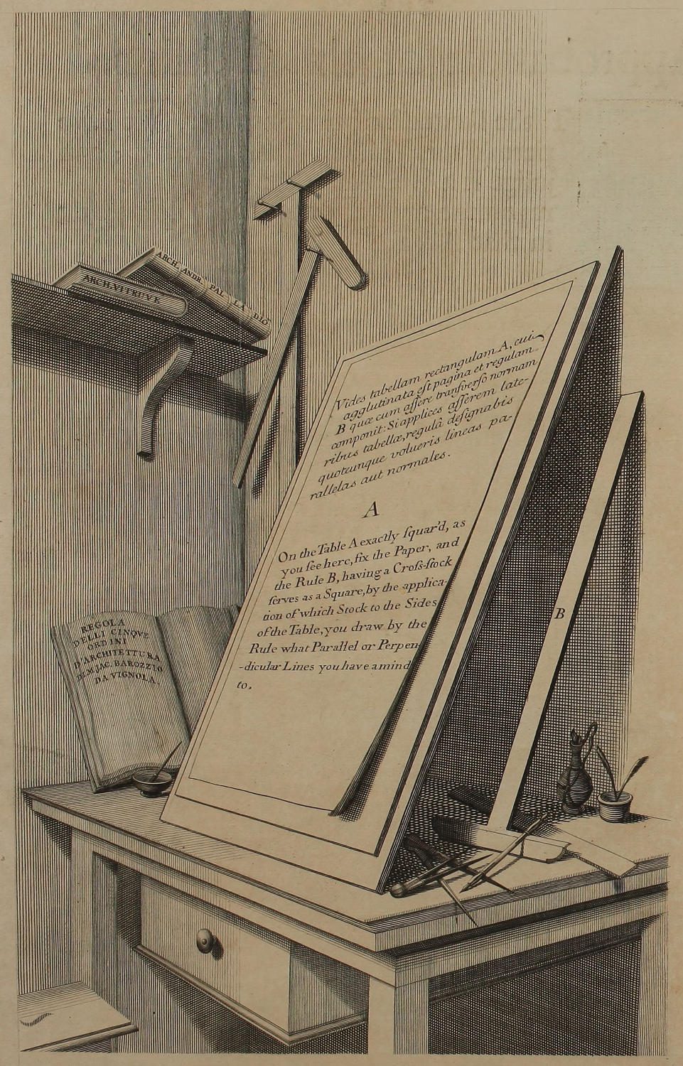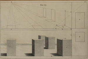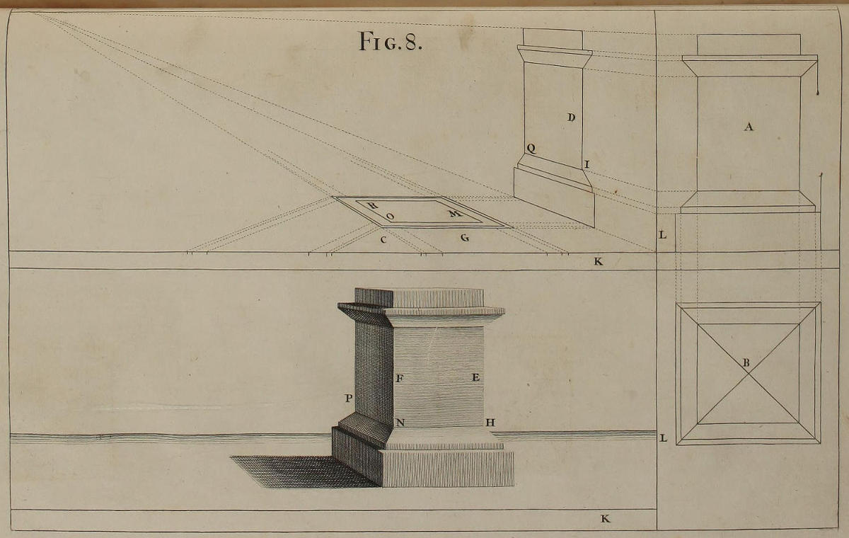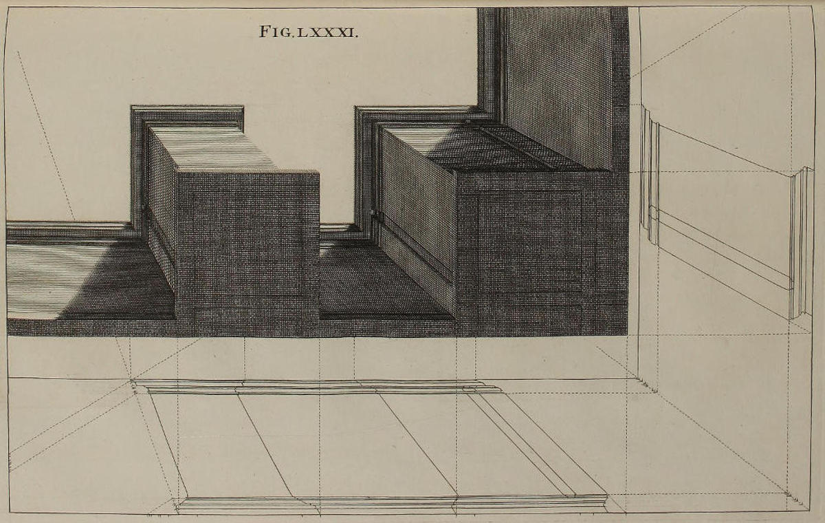 ’Tis something unaccountable, that, among so many learned Persons as have handled this Subject, Priests, Architects, and Painters; very few, if any of them, have given Directions proper for shunning that Disorder and Confusion of Lines, which, in most Instances, must necessarily attend the Execution of their Rules: In all or most of which, the whole Space for the Performance is confin’d between the Lines of the Plan and Horizon; which, where the Scale is small, and the Height of the Eye not very much advanc’d, renders the Work exceedingly confus’d; and where those Lines are coincident, (which frequently happens) the Method becomes utterly impracticable.