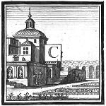 Ut principia Perspectivæ faciliùs intelligas, pono tibi ob oculos Templum, in cujus interiori facie, præter cætera, pingendum sit aliquid ad Perspectivam pertinens. Templi hujus vestigium geometricum est A, elevatio geometrica in longum est B, in latum est C. In A est locus Hominis aspicientis lineam DE, cui paries pingendus incumbit. In B idem Homo ex eâdem distantiâ intuetur lineam FG, quæ refert elevationem parietis. In figura C supponimus Hominem consistere è regione ipsius parietis: easdemque proportiones mensuratum translatas esse ex vero pariete in figuram C, quæ ipsum in parvo repræsentat.