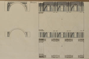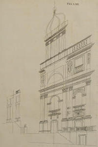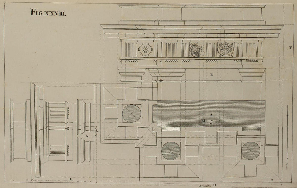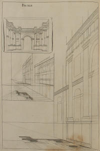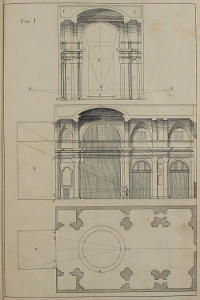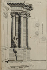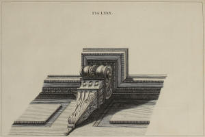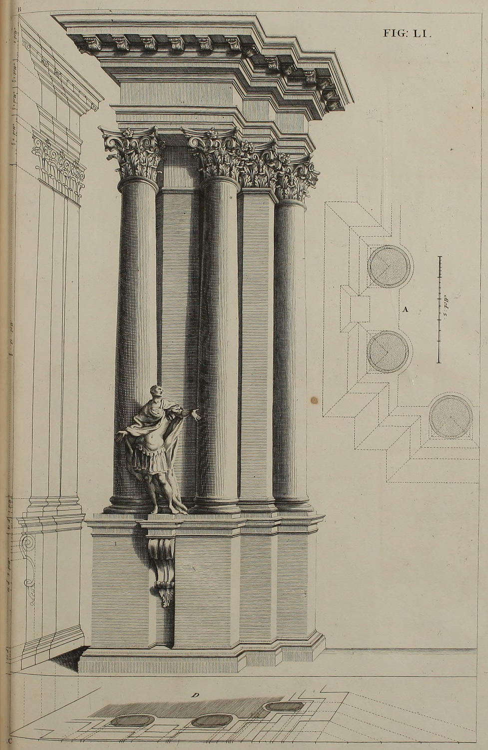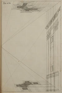 The Perspective of Structures here treated of, can have no Grace or Proportion, without the Help of Architecture. ’Tis therefore absolutely necessary, that you employ yourself for some time in Drawing, and the Study of that Art; till you can readily describe the Plan of any Upright, and from thence project the Section or Profile, as is shewn through the whole Course of this Work; and more particularly, in the Sixty-eighth and Seventieth Figures: Forasmuch as the proper Depth of each Part of the Perspective, is determin’d by the Plan and Profile thereof.