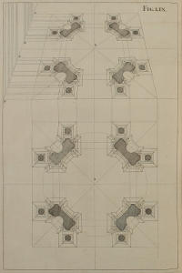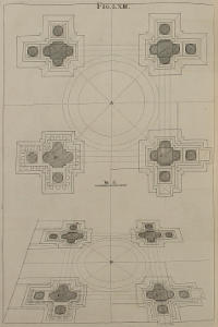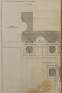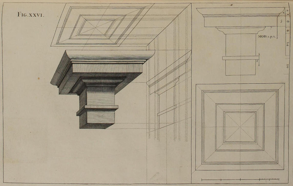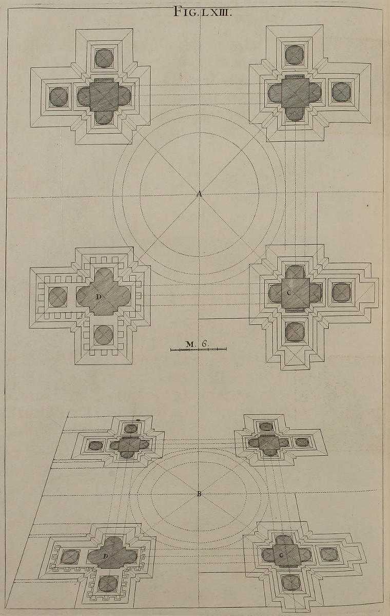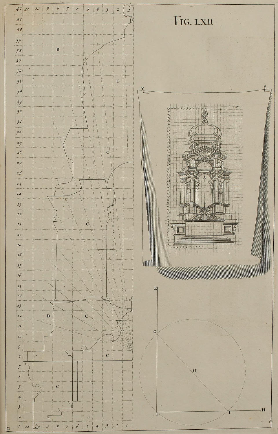 III. That from the Disposition of the Perspective-Plans and Uprights, with respect to the finish’d Pieces in the Twelfth and many following Figures, you would observe, with what Dispatch the said Pieces may, without the Help of Compasses, be delineated by your Drawing-Square; viz. the Perpendiculars from the Perspective-Plan, and the level Lines from the Perspective-Upright, or Section.