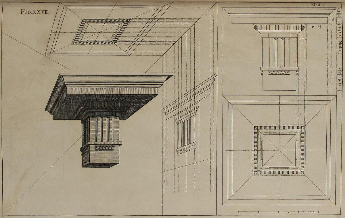 Optica delineatio coronicis Doricæ, | XXVII. | The Dorick Entablature in Perspective. |